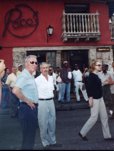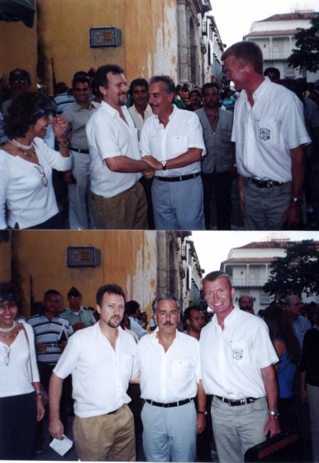 Ashley, more accustomed to expensive autowind cameras hadn't realised you had to manualy wind the film. I still had a few more shots left. Everyone was whispering "Mira! El Presidente de la Republica!" People started surrounding him and shaking his hand. A woman I assume was his personal assistant overheard us debating the correctness of asking the President to pose a second time. She said to me, in English, "Don't worry, I will ask him to pose for you". Just as the crowd started to close in on him and he turned to leave, his PA asked him to talk to us. He put his arm around me, and asked here I was from. When I replied Australia, he seemed surprised - I am the sole Australian resident in Cartagena and one of a handful living in Colombia. He shook my hand and waited a while, but not too long, the security would be too comprimised. He is the President of a country of 40 million people embroiled in a civil war and the guerrillas and narcos have a price on his head. Just 5 days after this photo was taken he cancelled peace talks and started bombing rebel bases in retaliation to the hijacking and kidnapping of a Colombian senator. A friendly press photographer took these photos for me. That's his autograph in my right hand. Ashley is a little famous too, he rode his BMW motorbike from Tierra del Fuego to Anchorage Alaska and is the author of the forthcoming book Lonesome Rhodes.